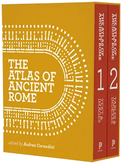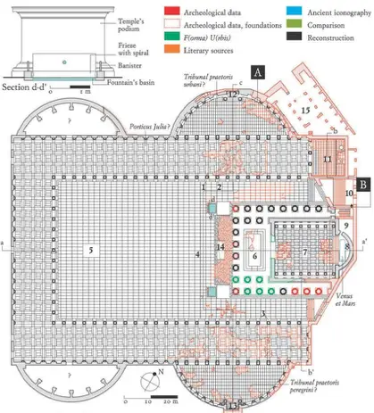 The Atlas of Ancient Rome," 2017 Carandini takes a very through approach that is close to a best practice for printed material. Carandini documented each structure in Rome in multiple diagrams, including both a realistic visualization of the reconstructed structure and a diagram which traces individual building elements to specific sources. There is a clear color coding provided in a legend to each diagram, with categories such as "Archeological data," "Literary sources," and "Ancient iconography." The book also has a second volume with additional details of each citation.
