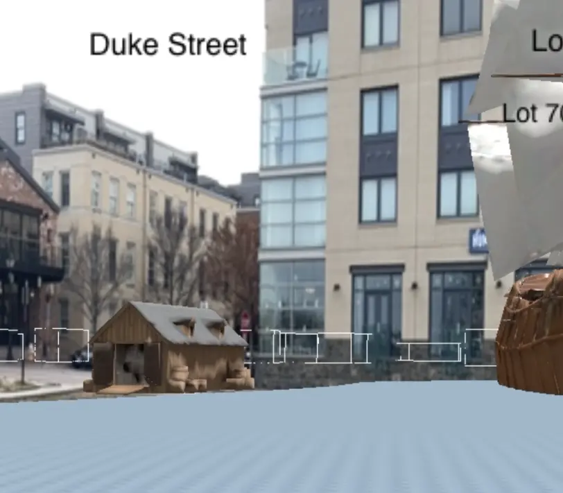 As an example, here is our basic 2D and basic 3D augmented reality view of the Carlyle Warehouse on the Alexandria, Virginia, waterfront in about 1780. The building's dimensions are known from excavation, as is the basic wooden material. The site of the building is now roughly located under the present-date Indigo Hotel. However, rendering the warehouse as a plain block of wood with those dimensions is not very compelling.